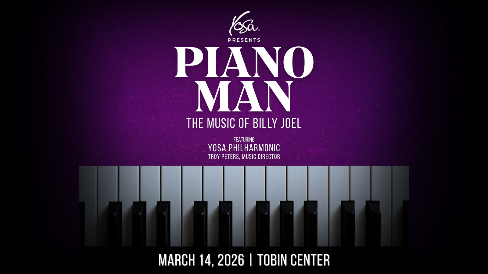 “YOSA Presents Piano Man: The Music of Billy Joel” is on Saturday, March 14, 2026, at 8:00 p.m. at the Tobin Center for the Performing Arts.